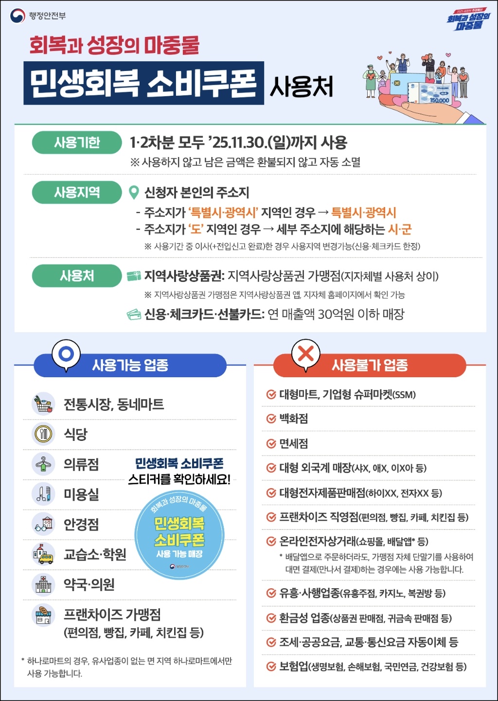 ❗ 사용 불가 업종: 대형마트, 백화점, 복합쇼핑몰, 기업형 슈퍼마켓(SSM), 대형 외국계 매장(애플, 이케아 등), 대형 전자제품 판매점, 면세점, 유흥·사행성 업종, 온라인 전자상거래, 배달앱 결제, 프랜차이즈 직영점, 면세점, 온라인 쇼핑몰, 유흥업소 등