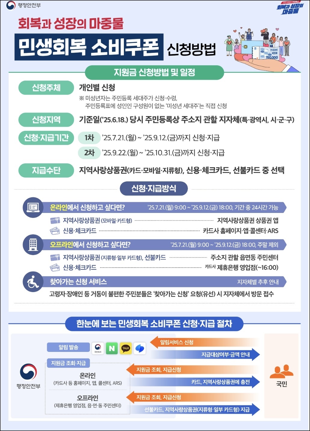 | 신청처 | 정부24, 지역사랑상품권 앱, 카드사 홈페이지·앱·콜센터·ARS | 주민센터(읍면동), 카드사·은행 영업점 |