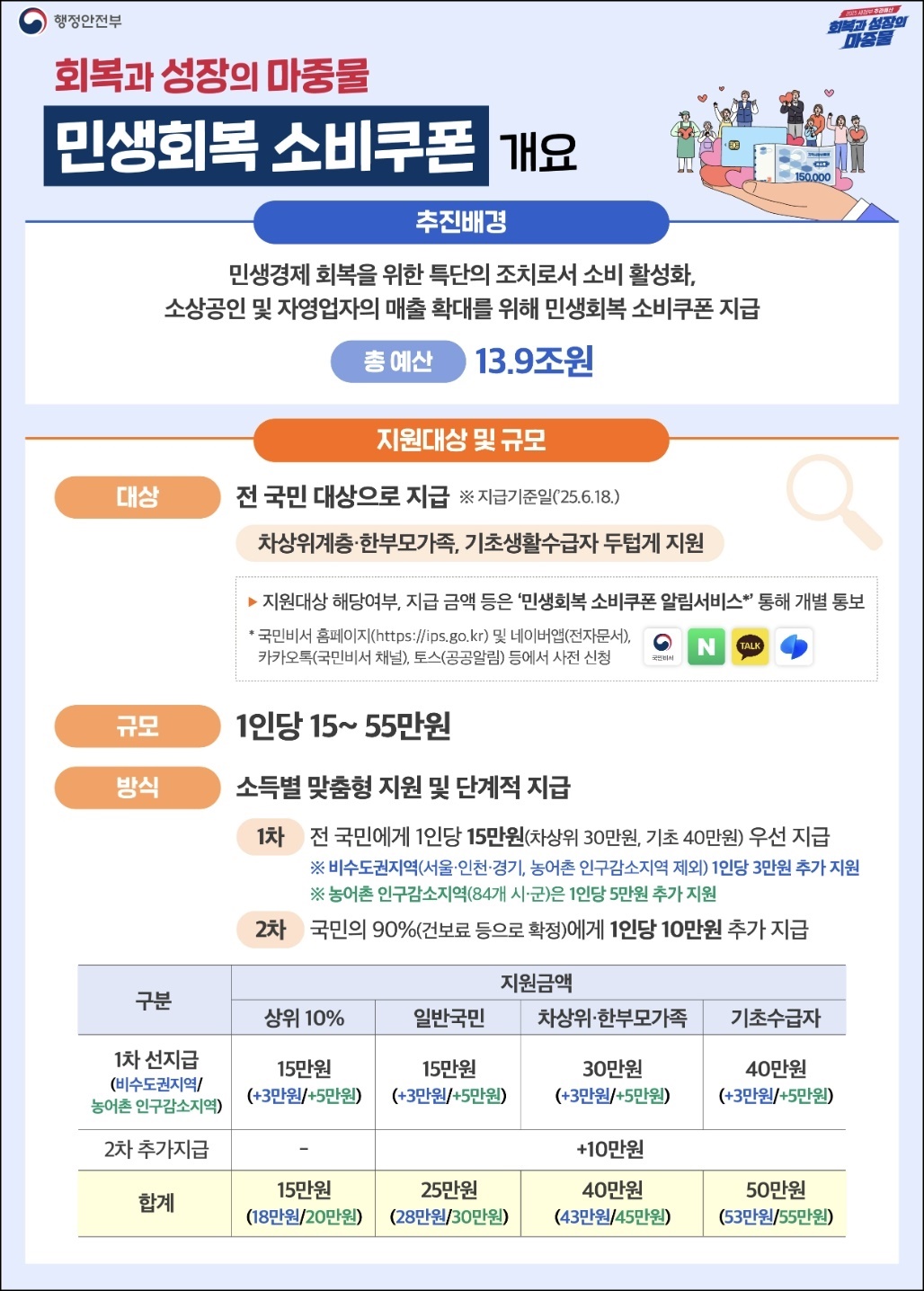 **정부가 지급하는 한시적 소비 쿠폰(지원금)**으로, 일정 금액을 지역화폐 또는 선불카드 형태로 지급해 지역 상권 소비를 유도하는 정책입니다.