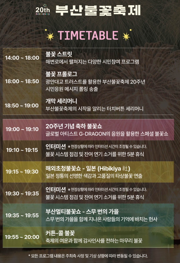 제20회를 맞이하는 2025 부산불꽃축제는 단순한 볼거리를 넘어, 부산 시민과 관광객이 함께 만들어가는 특별한 문화 축제입니다. 광안리 바다 위에서 펼쳐지는 화려한 불꽃과 음악의 향연은 잊지 못할 추억을 선사할 것입니다.