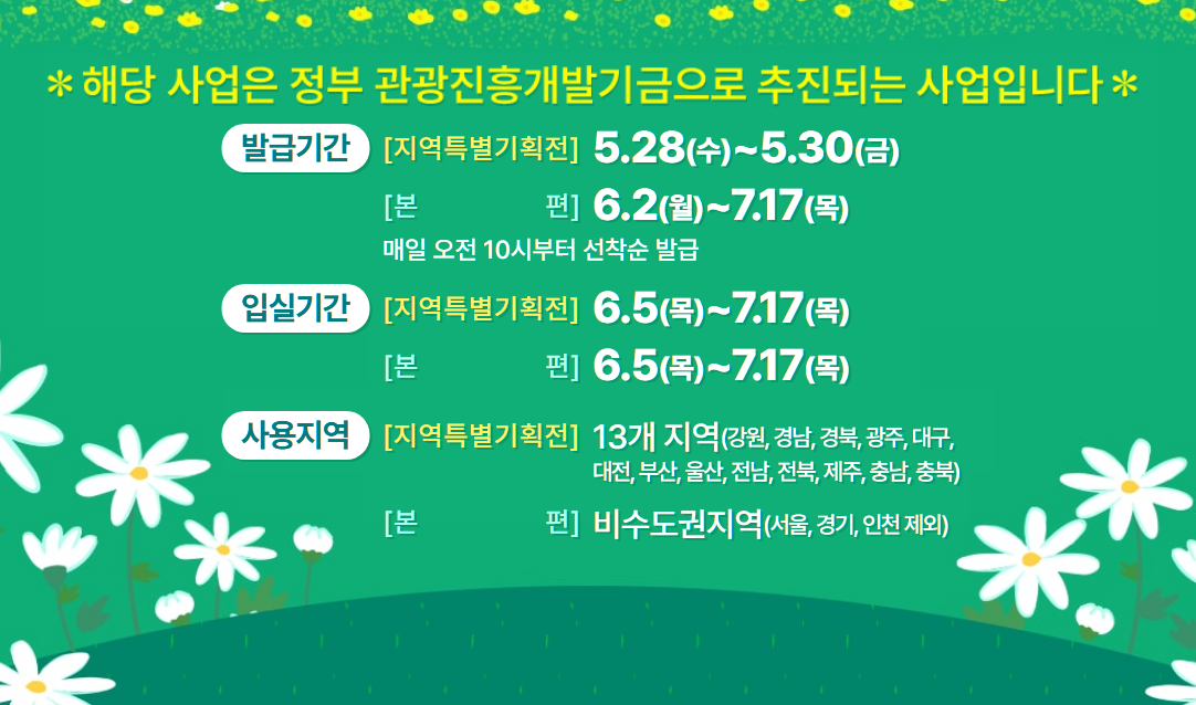 | 2025 대한민국 여름맞이 숙박세일 페스타 지역특별기획전 할인권 신청 (0) | 2025.05.26 |