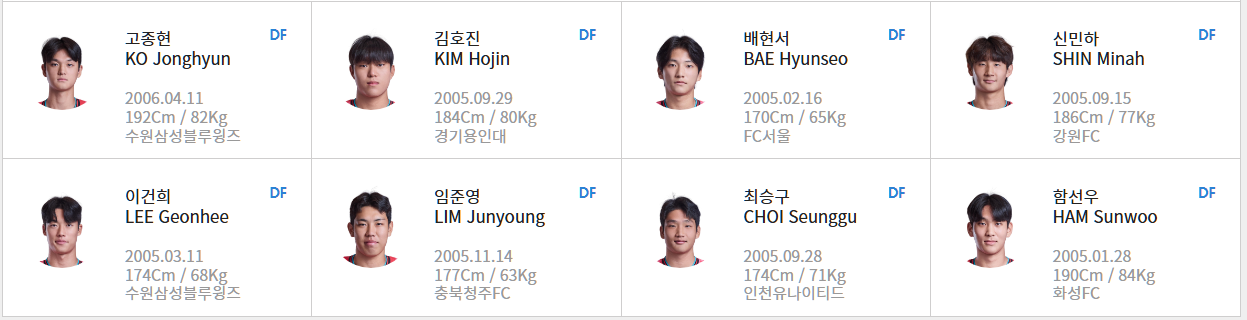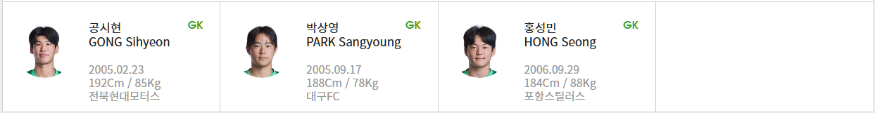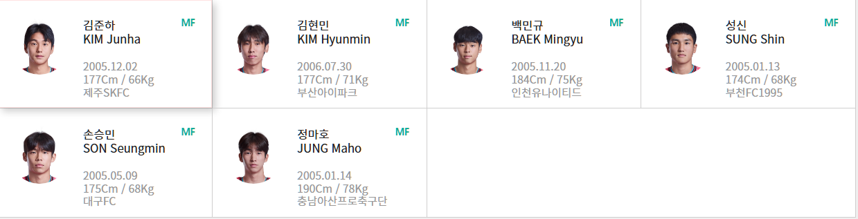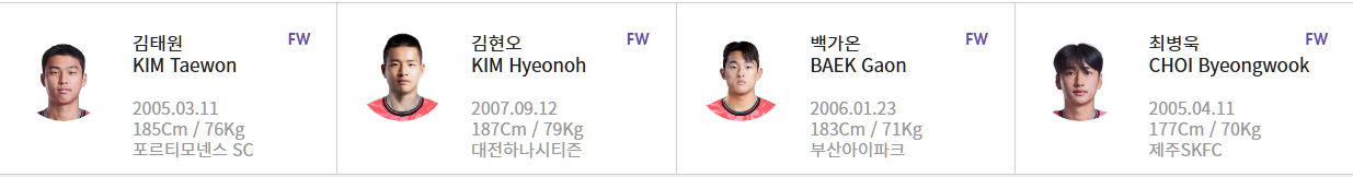 김태원(포르티모SC) 김현오 (대전 하나시티즌) – 2007년생 막내 백가온 (부산 아이파크) 최병욱(제주SKFC) |