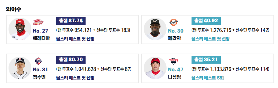 - 팬, 선수, 미디어 투표로 선정되며, 외야수 상위 3명은 별도 선발 방식입니다.
