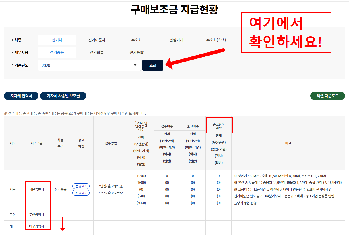 - 법인 및 단체 물량: 2026년부터 법인차량에 대한 보조금 할당 방식이 변경되었으므로, 개인 구매자와 법인 구매자의 잔여 물량 탭을 구분해서 확인해야 합니다.