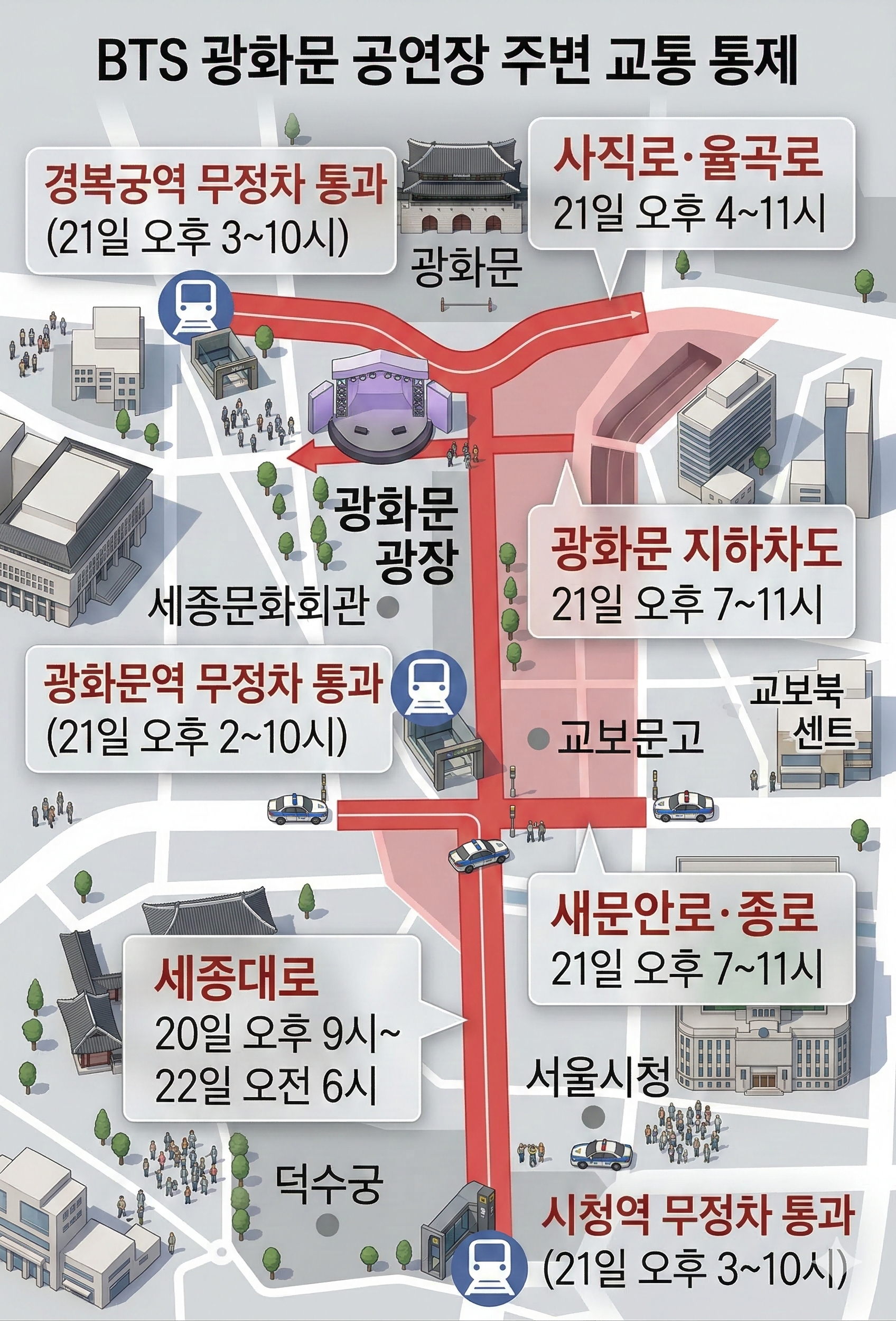 역대급 규모로 진행될 방탄소년단(BTS)의 컴백 공연! 무엇보다 중요한 것은 나와 모두의 **'안전'**입니다. 오늘 안내해 드린 교통 통제 및 지하철 무정차 통과 시간을 미리 숙지하시고, 짐은 최소한으로 가볍게 챙겨서 오시는 것을 추천해 드립니다.