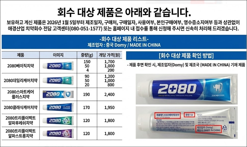 ※ 국내에서 생산된 2080치약 제품은 회수 대상이 아닙니다.