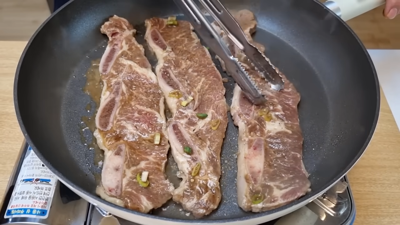 - 굽기 비법: 팬에 고기를 올리고 양념 국물을 한국자 정도 끼얹어주세요. 과일 즙만 사용했기 때문에 센 불에서 졸이듯 구워도 쉽게 타지 않으며, 고기 표면이 코팅되어 윤기가 흐르게 됩니다.