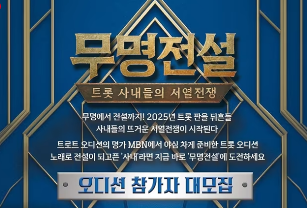 **MBN 무명전설**은 2025년 가을 첫 방송 예정인 MBN의 대형 남자 트로트 오디션 프로그램입니다. 공식 슬로건은 **‘트롯 사내들의 서열전쟁’**으로, 트로트를 사랑하는 남성이라면 누구나 나이, 국적, 경력에 관계없이 지원할 수 있습니다. 참가 자격에는 제한이 없어, 일반인, 현직 트로트 가수, 아이돌, 국악·성악·뮤지컬 등 타 장르 가수까지 모두 도전할 수 있습니다.