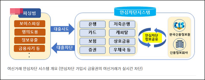 '여신거래 안심차단 서비스'란, 신용정보원과 금융기관 간의 정보 연동을 통해 신용조회, 대출, 카드 발급 등 금융거래를 원천 차단하는 무료 서비스입니다.